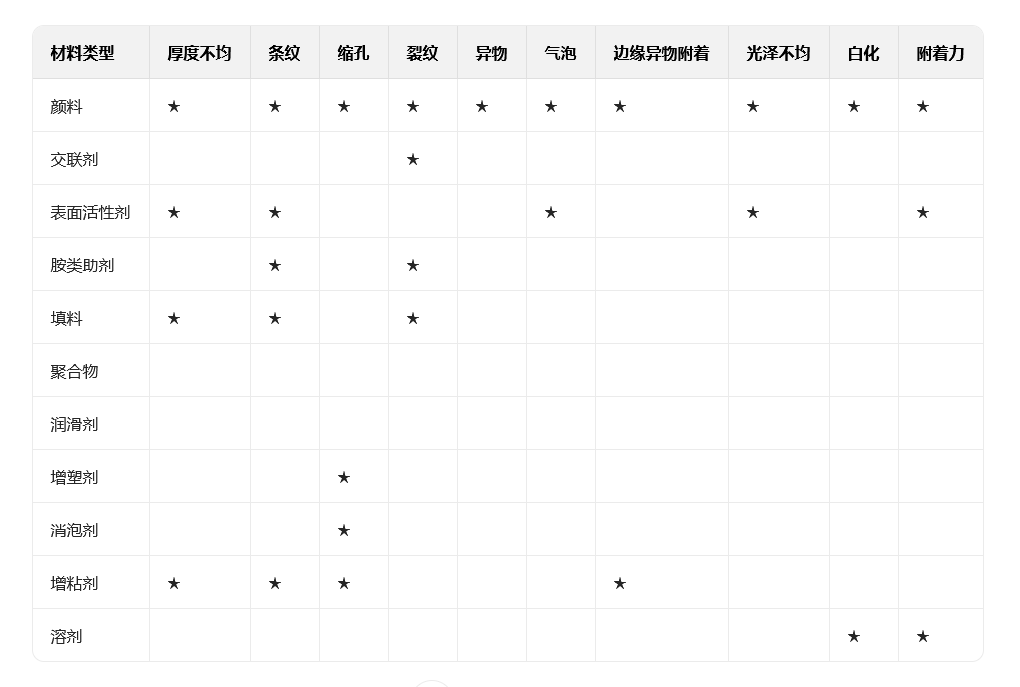厚度不均:因黏度不適、基材帶電、馬蘭戈尼效應等導致。可通過消除基材靜(jìng)電、調整幹燥條件、優(yōu)化供液(yè)位置等解決。